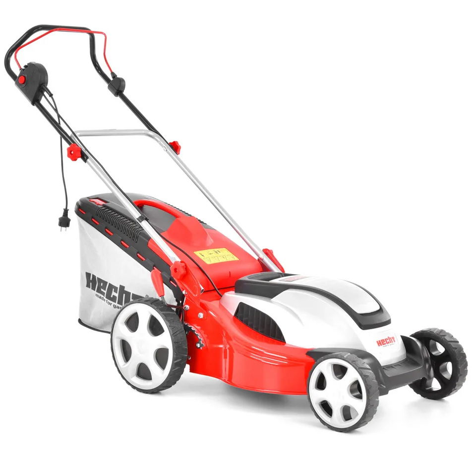 A HECHT 1845 nem önjáró elektromos fűnyíró, amit tartós fém házzal szereltünk fel, ami nem csak elég masszív, de kellően védi a gép használóját a kés által feldobott tárgyaktól. Az acél kések munkaszélessége 46 cm, amit 1800 W nagy forgatónyomatékú „TURBO” elektromos motor hajt meg. A vágási magasságot központilag, egyetlen kar segítségével lehet állítani 30 -75 mm tartományban. A masszív konstrukció ellenére a fűnyíró súlya csak 23,8 kg. Ezen paraméterek figyelembe vételével a fűnyírót maximum 1000 m2-nyi terület rendszeres gondozására ajánljuk. Az ilyen fűnyírók természetes tartozéka az összecsukható fogantyú. Nagy előnye továbbá, hogy a motor vezérlésének karja fogantyú teljes hosszában elérhető, ennek köszönhetően a fűnyírót egy kézzel is lehet irányítani, így a másik kezével például biztonságosan tudja a vezetéket irányítani. Természetesen a gép fel van szerelve biztonsági kapacsolóval és a vezeték feszülését megakadályozó füllel is.