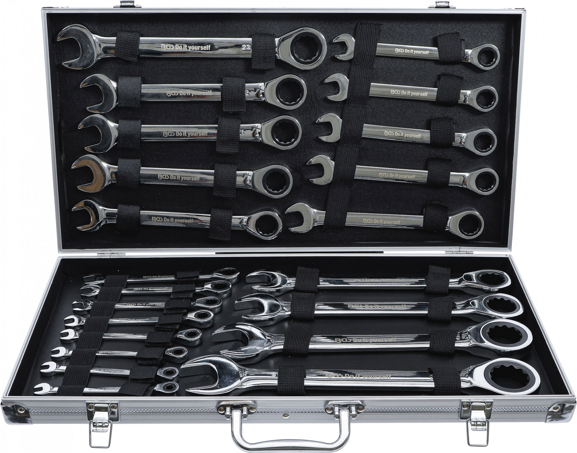 22 részes racsnis csillag-villáskulcs készlet praktikus alumínium táskában.